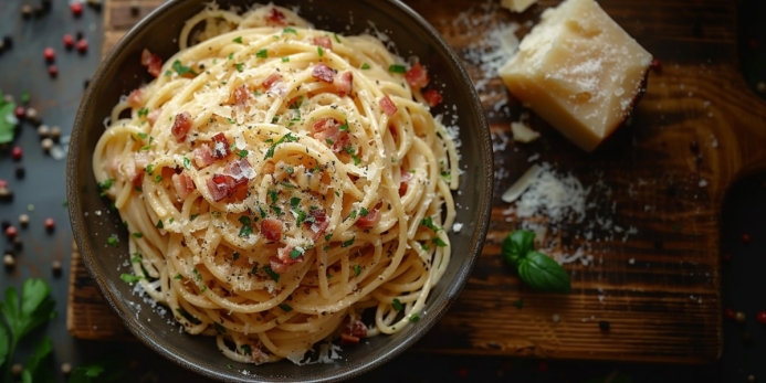 Unlike many modern versions, a true carbonara contains no cream, relying instead on eggs, cheese, and cured pork to create its signature silky sauce.